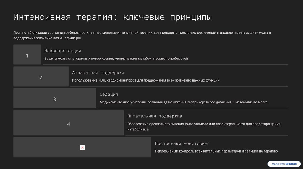 Интенсивная терапия: ключевые принципыПосле стабилизации состояния ребенок поступает в отделение интенсивной терапии, где проводится комплексное лечение, направленное на защиту мозга и