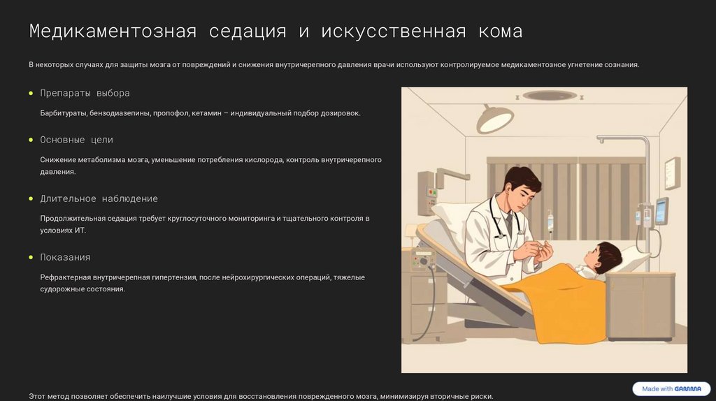 Медикаментозная седация и искусственная комаВ некоторых случаях для защиты мозга от повреждений и снижения внутричерепного давления врачи используют контролируемое медикаментозное угнетение сознания.