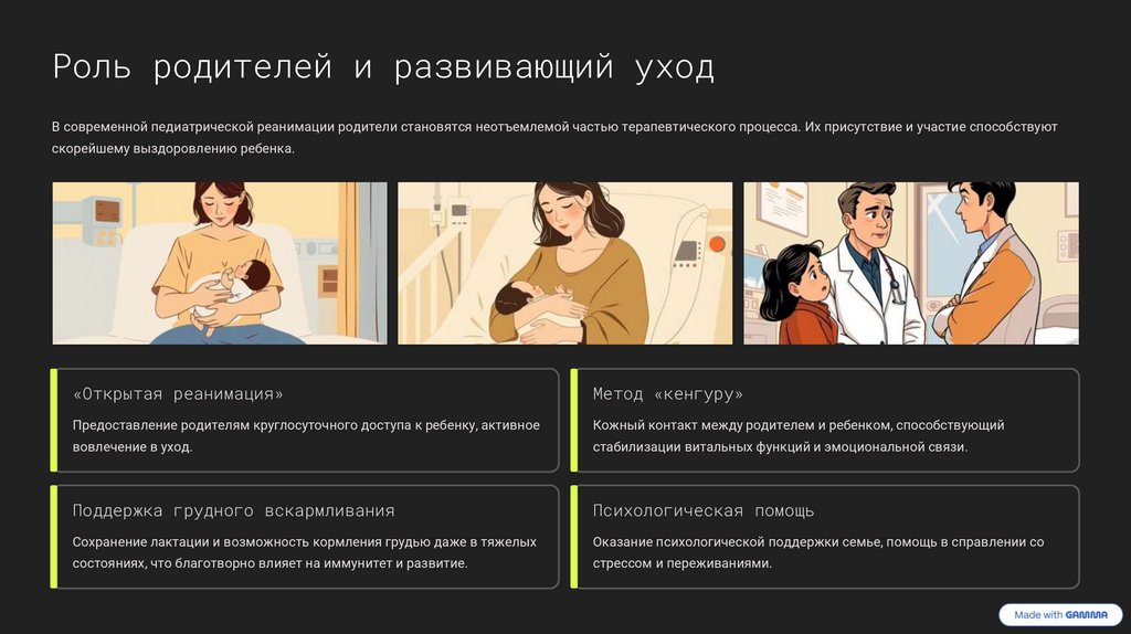 Роль родителей и развивающий уходВ современной педиатрической реанимации родители становятся неотъемлемой частью терапевтического процесса. Их присутствие и участие способствуют
