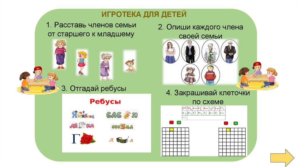 ИГРОТЕКА ДЛЯ ДЕТЕЙ1. Расставь членов семьи