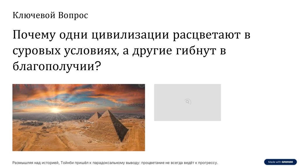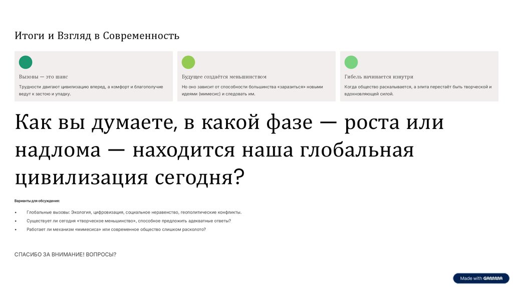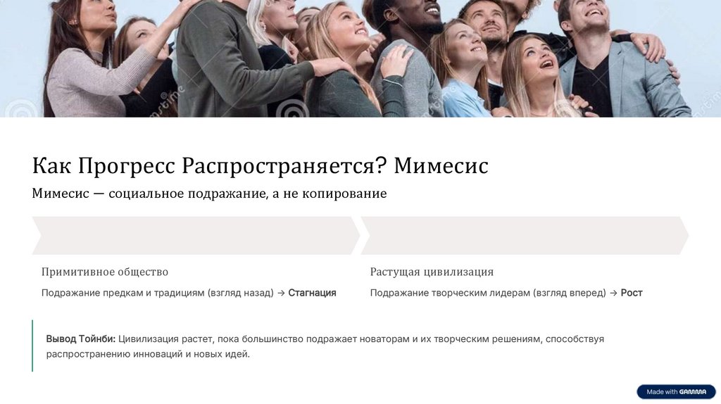 Вывод Тойнби: Цивилизация растет, пока большинство подражает новаторам и их творческим решениям, способствуя