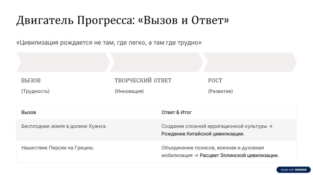 Двигатель Прогресса: «Вызов и Ответ»«Цивилизация рождается не там, где легко, а там где трудно»
