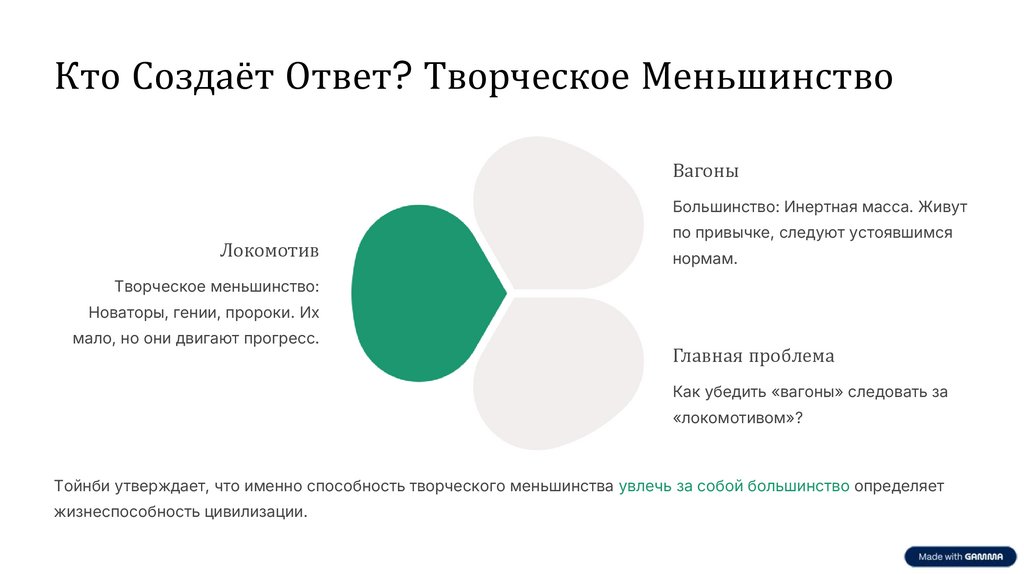 Тойнби утверждает, что именно способность творческого меньшинства увлечь за собой большинство определяет