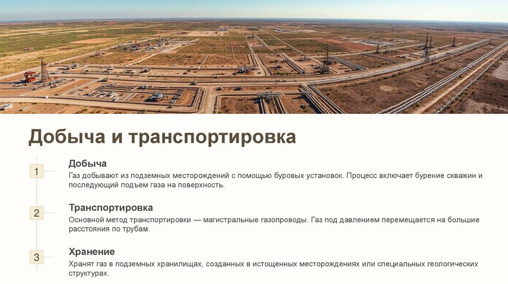 Газ добывают из подземных месторождений с помощью буровых установок. Процесс включает бурение скважин и