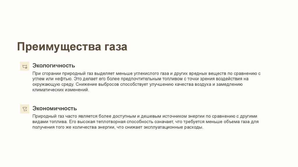При сгорании природный газ выделяет меньше углекислого газа и других вредных веществ по сравнению с