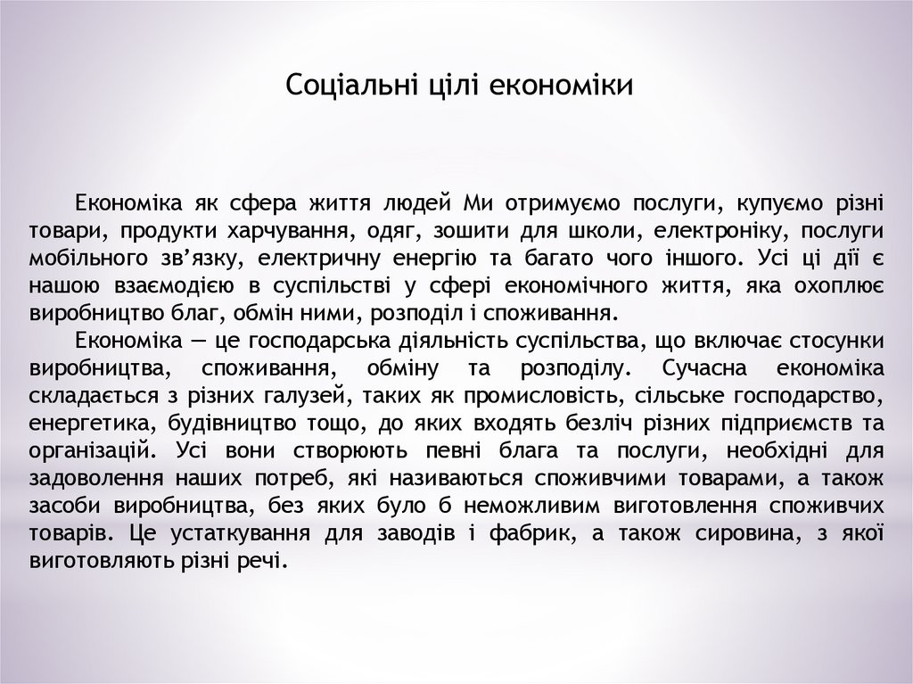 Соціальні цілі економікиЕкономіка як сфера життя людей Ми отримуємо послуги, купуємо різні