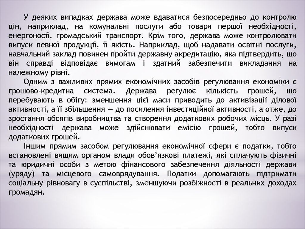Іншим прямим засобом регулювання економічної сфери є податки, тобто