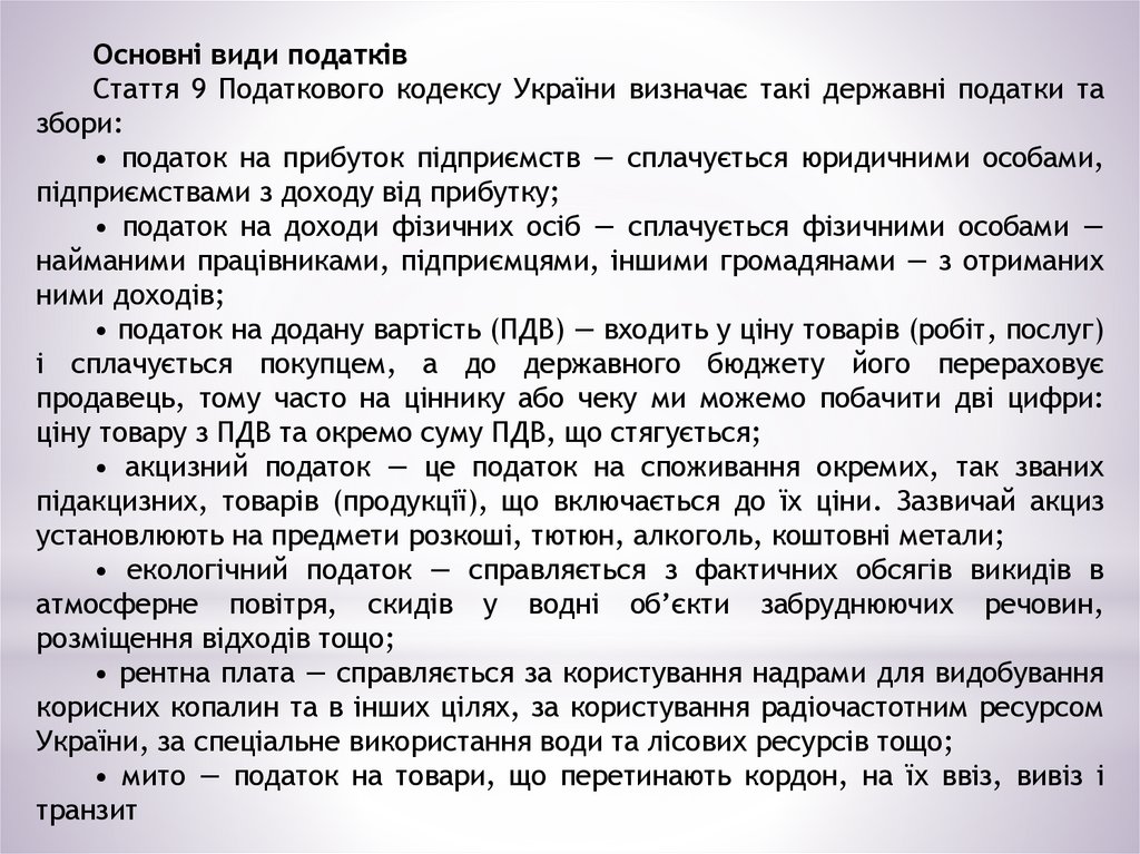 Основні види податківСтаття 9 Податкового кодексу України визначає такі державні податки та