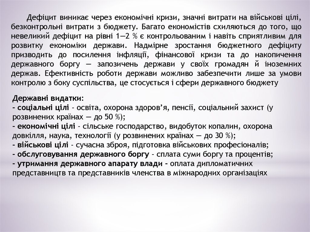Дефіцит виникає через економічні кризи, значні витрати на військові цілі,безконтрольні витрати з бюджету. Багато економістів схиляються до того, що
