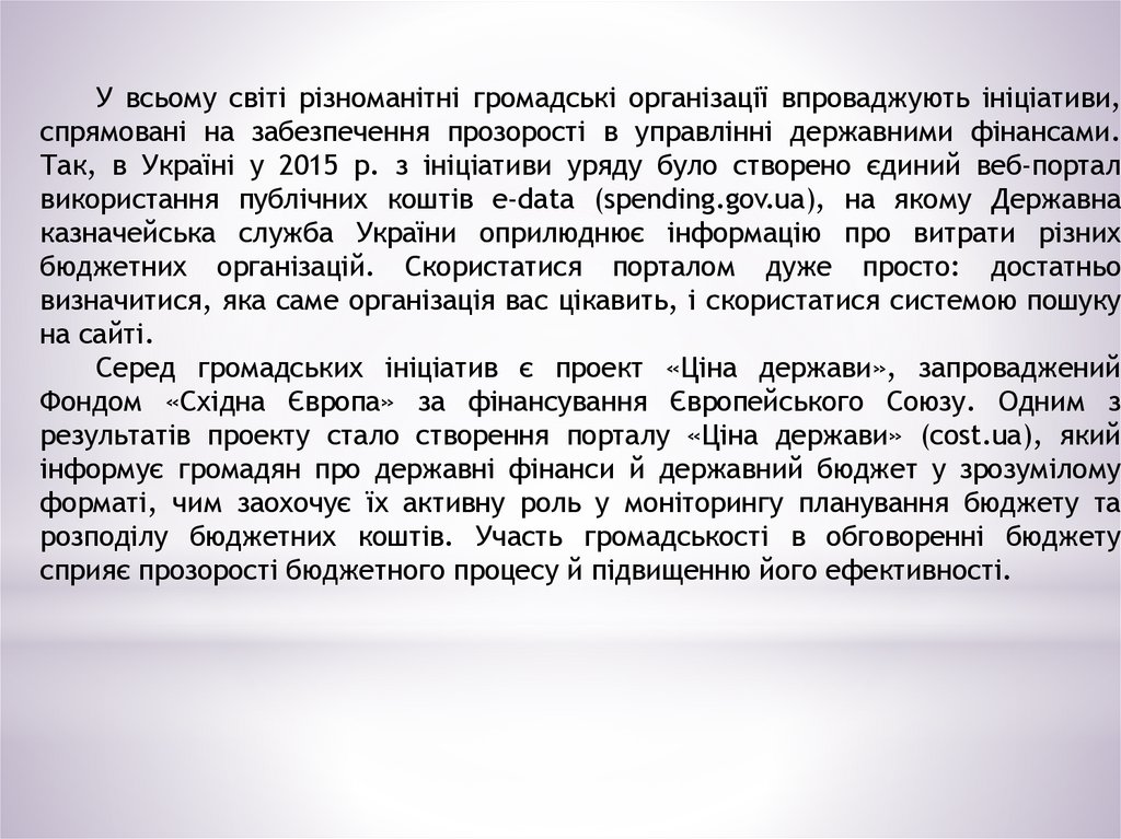У всьому світі різноманітні громадські організації впроваджують ініціативи,спрямовані на забезпечення прозорості в управлінні державними фінансами.