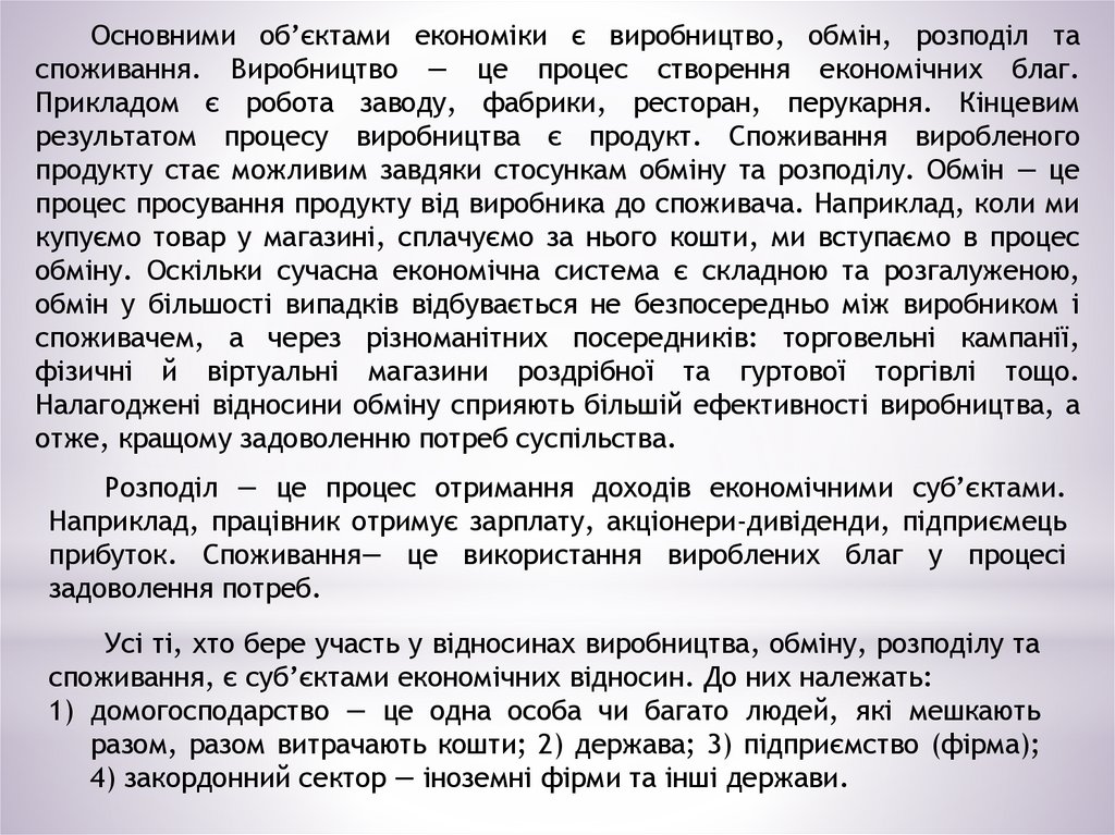 Основними об’єктами економіки є виробництво, обмін, розподіл таспоживання. Виробництво — це процес створення економічних благ.