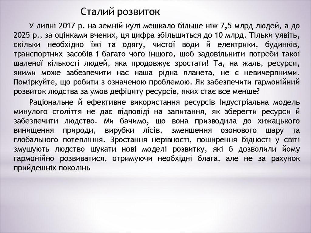 Сталий розвитокУ липні 2017 р. на земній кулі мешкало більше ніж 7,5 млрд людей, а до