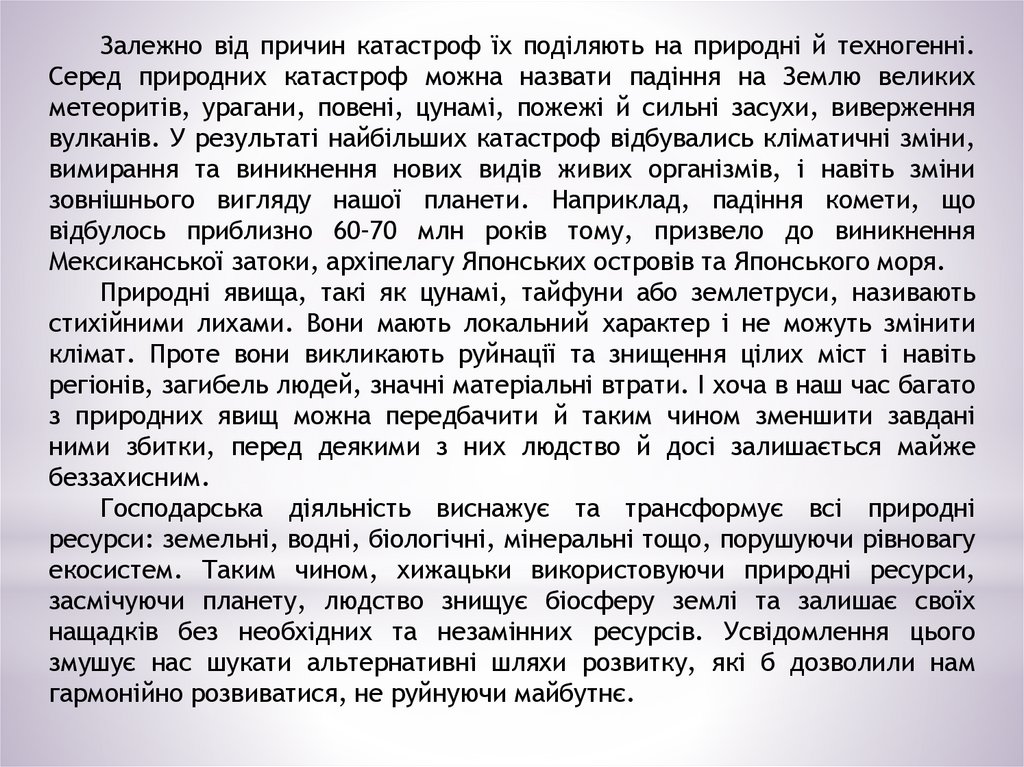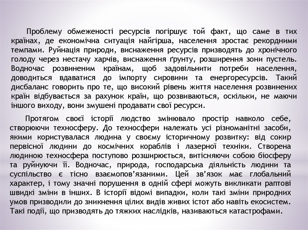 темпами. Руйнація природи, виснаження ресурсів призводять до хронічного