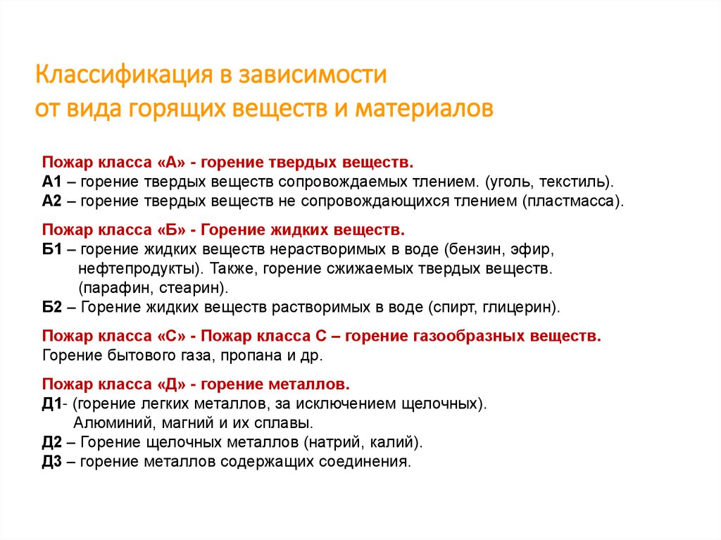 Классификация в зависимостиот вида горящих веществ и материалов