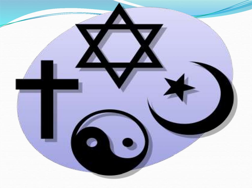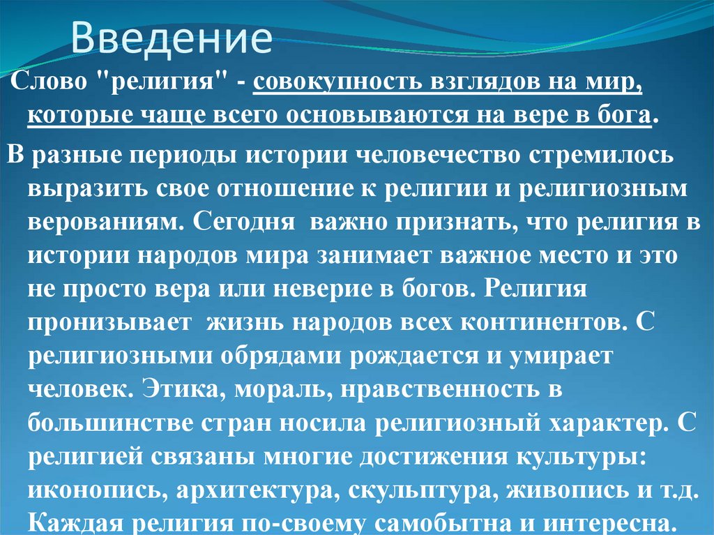 Слово "религия" - совокупность взглядов на мир,которые чаще всего основываются на вере в бога.