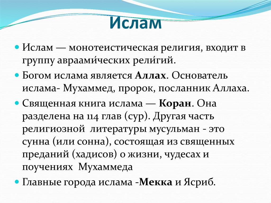 Ислам — монотеистическая религия, входит вгруппу авраами́ческих рели́гий.