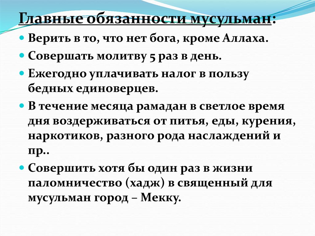 Главные обязанности мусульман:Верить в то, что нет бога, кроме Аллаха.