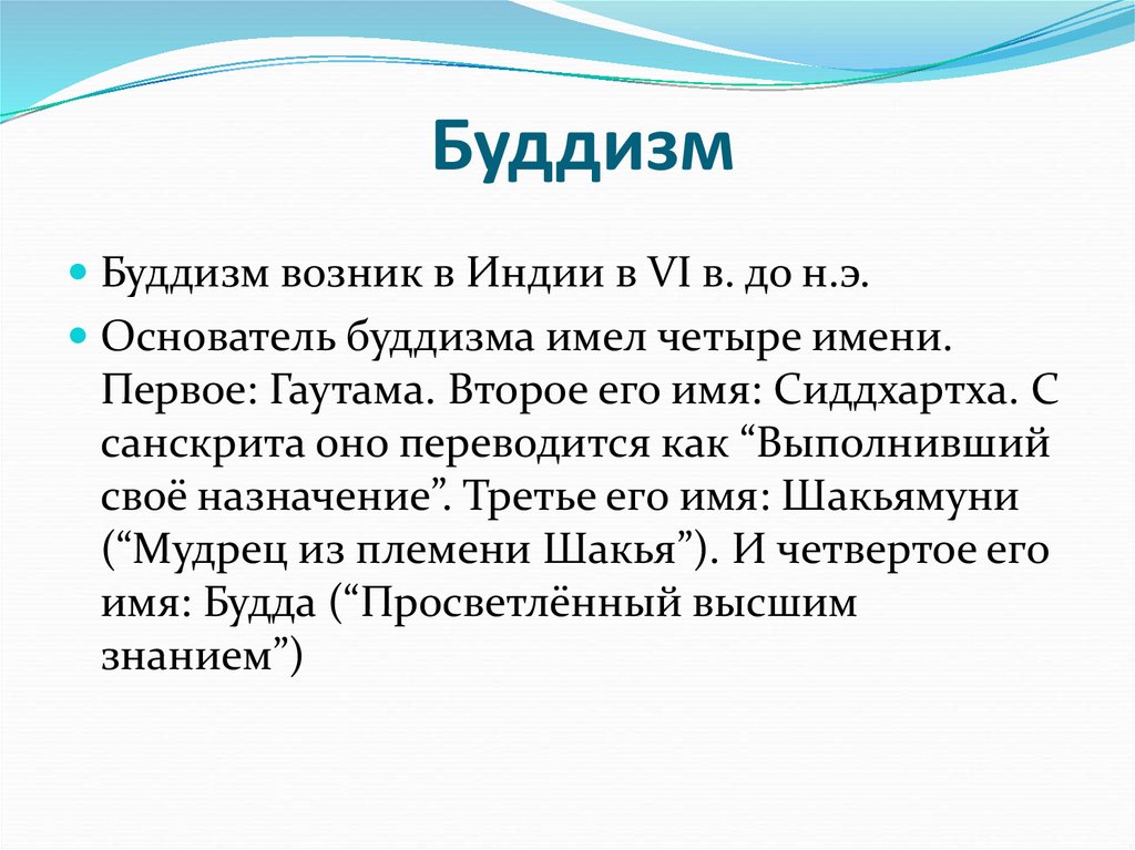 Буддизм возник в Индии в VI в. до н.э.Основатель буддизма имел четыре имени.