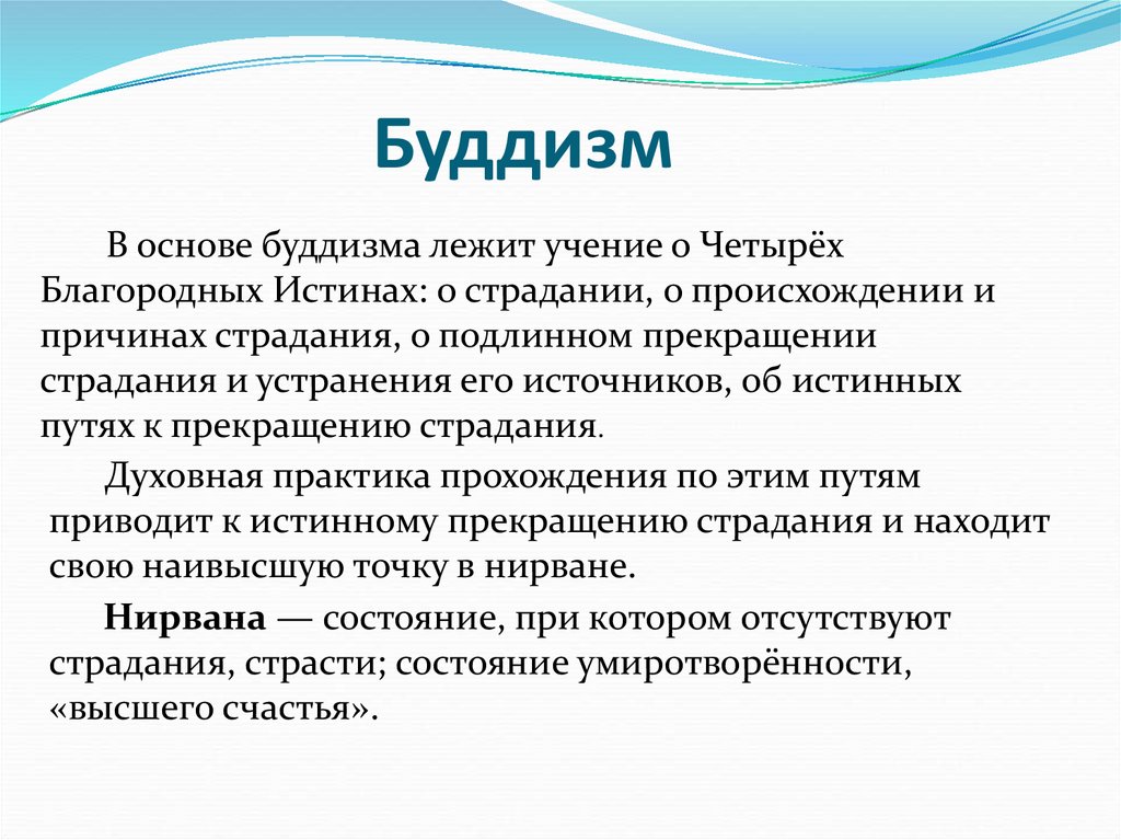 В основе буддизма лежит учение о ЧетырёхБлагородных Истинах: о страдании, о происхождении и