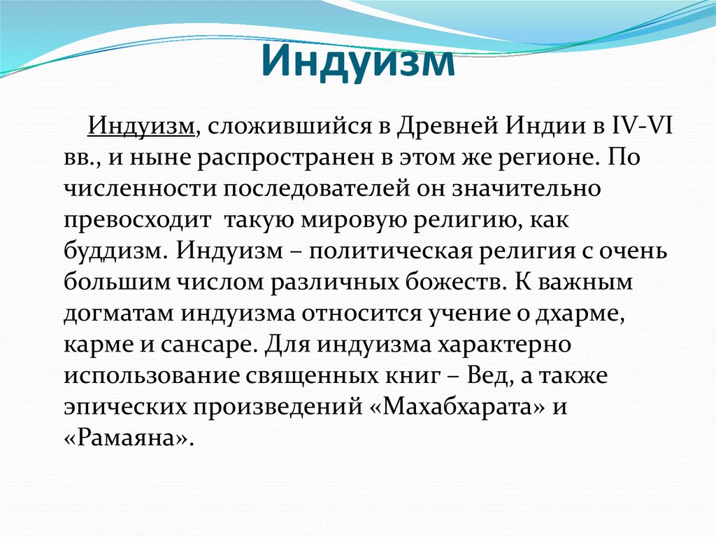 Индуизм, сложившийся в Древней Индии в IV-VIвв., и ныне распространен в этом же регионе. По