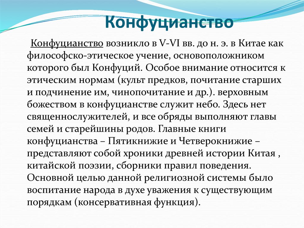 Конфуцианство возникло в V-VI вв. до н. э. в Китае какфилософско-этическое учение, основоположником