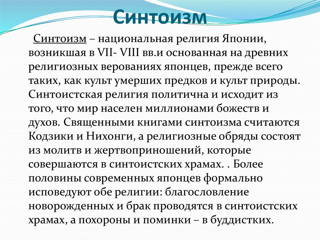Синтоизм – национальная религия Японии,возникшая в VII- VIII вв.и основанная на древних