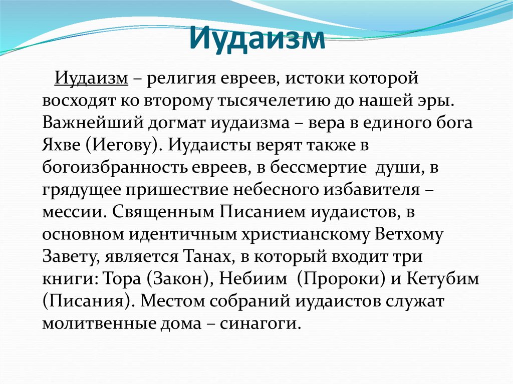 Иудаизм – религия евреев, истоки которойвосходят ко второму тысячелетию до нашей эры.