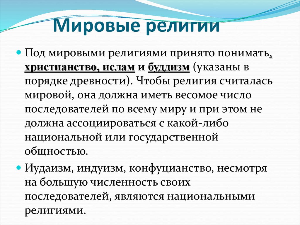 Под мировыми религиями принято понимать,христианство, ислам и буддизм (указаны в