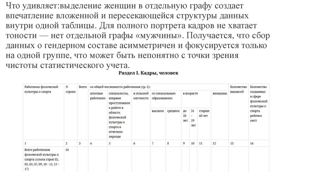 Что удивляет:выделение женщин в отдельную графу создаетвпечатление вложенной и пересекающейся структуры данных