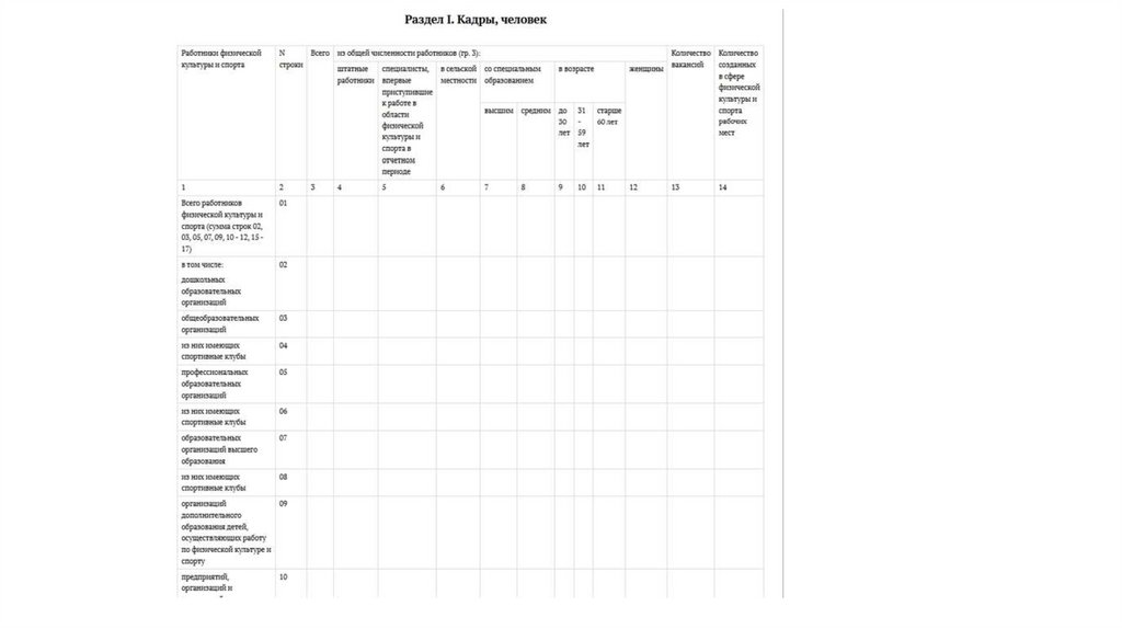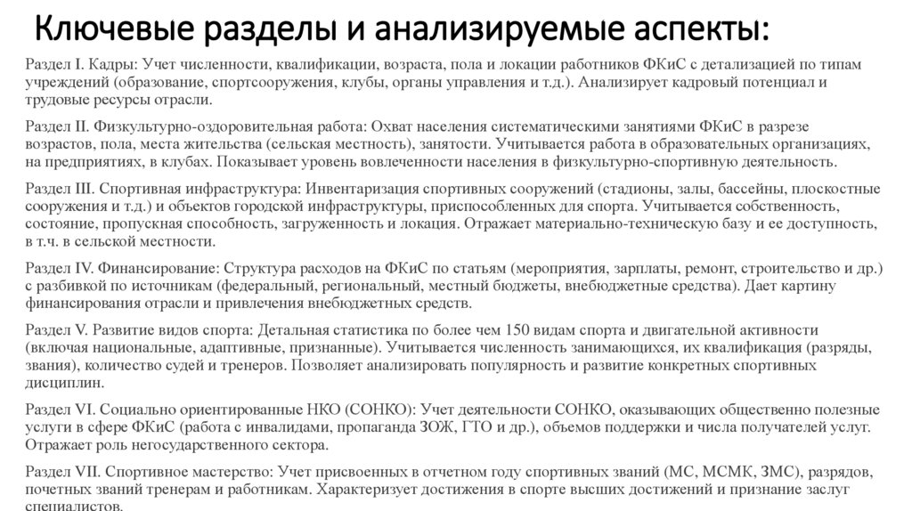 Ключевые разделы и анализируемые аспекты:Раздел I. Кадры: Учет численности, квалификации, возраста, пола и локации работников ФКиС с детализацией по типам