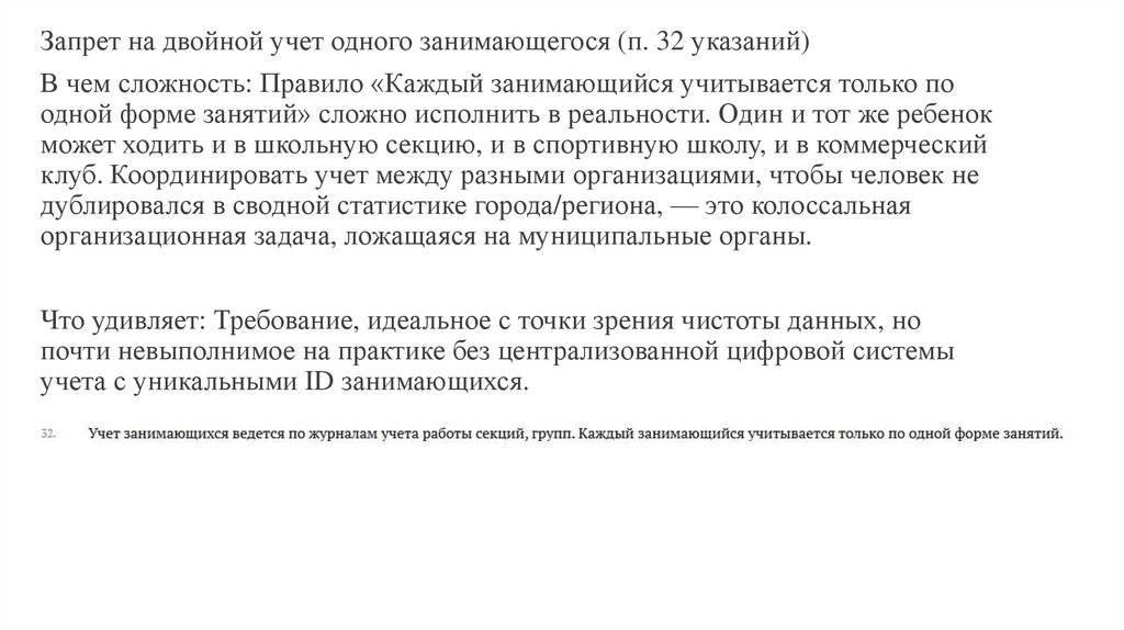 Запрет на двойной учет одного занимающегося (п. 32 указаний)В чем сложность: Правило «Каждый занимающийся учитывается только по