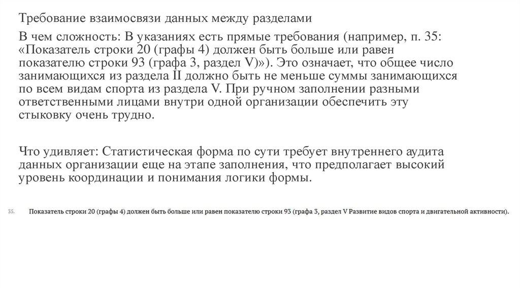 Требование взаимосвязи данных между разделамиВ чем сложность: В указаниях есть прямые требования (например, п. 35: