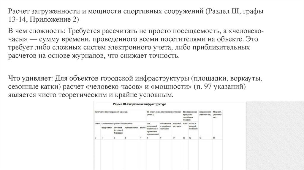 Расчет загруженности и мощности спортивных сооружений (Раздел III, графы13-14, Приложение 2)