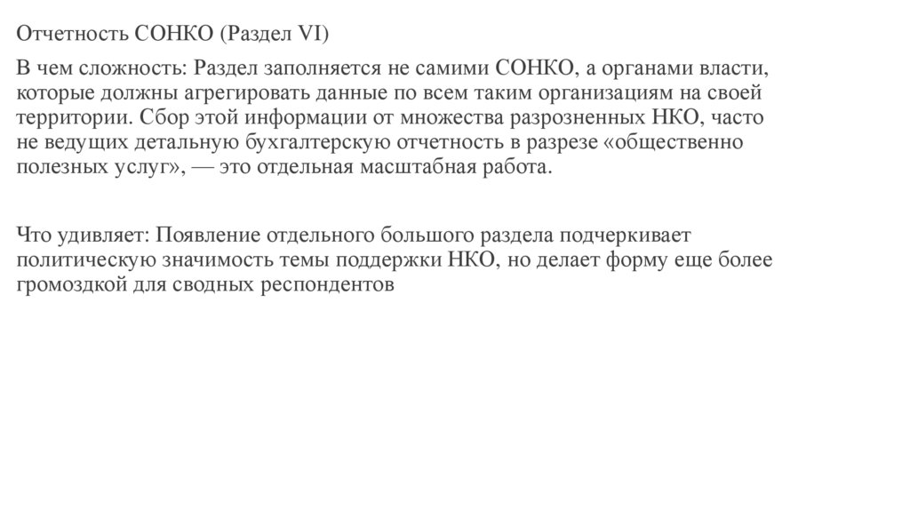 Отчетность СОНКО (Раздел VI)В чем сложность: Раздел заполняется не самими СОНКО, а органами власти,