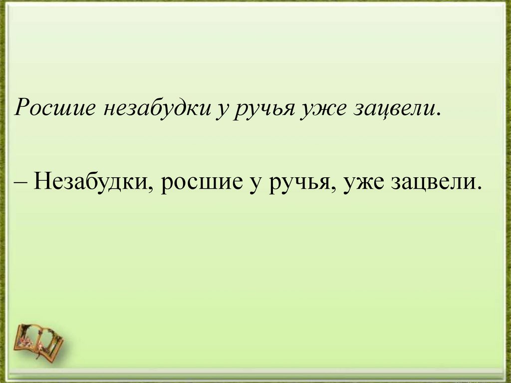 Росшие незабудки у ручья уже зацвели.– Незабудки, росшие у ручья, уже зацвели.