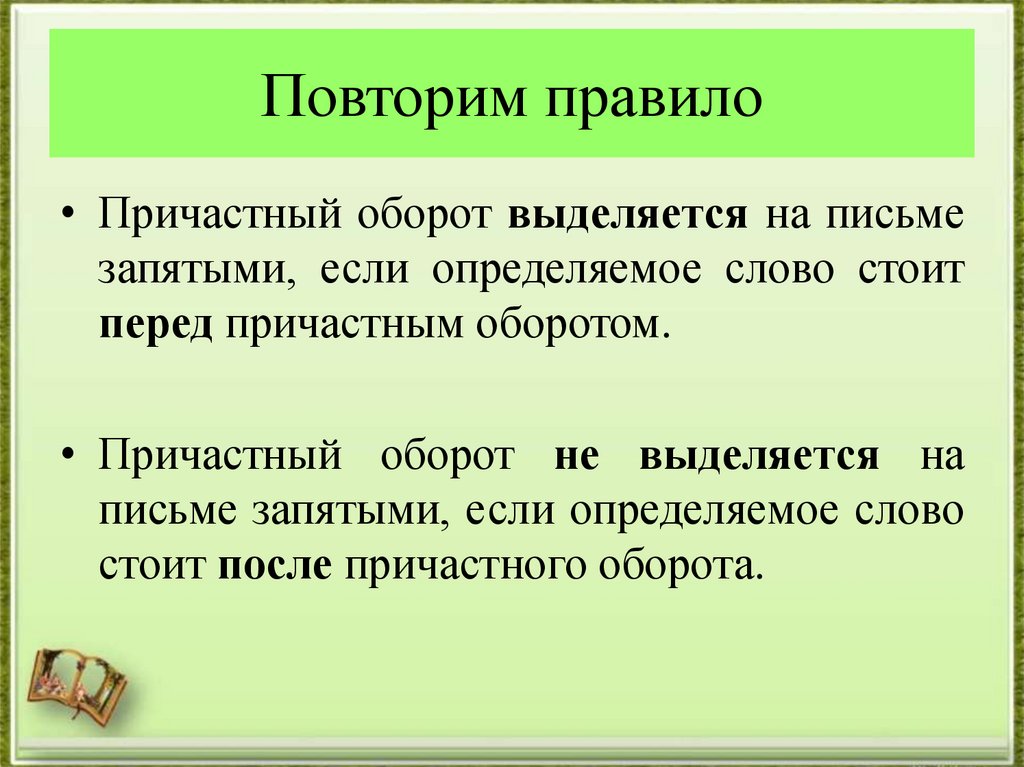 • Причастный оборот выделяется на письмезапятыми, если определяемое слово стоит