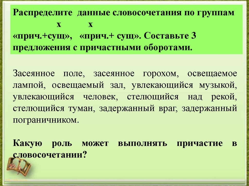 «прич.+сущ», «прич.+ сущ». Составьте 3