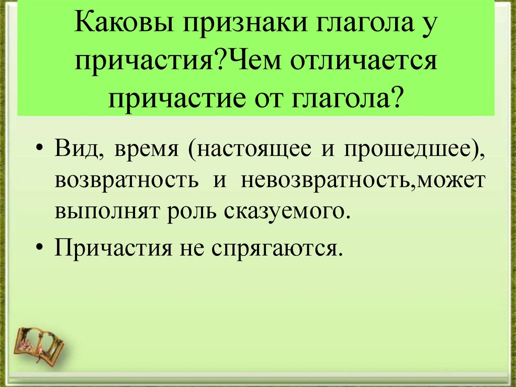 5. Каковы признаки глагола у причастия?Чем отличается причастие от глагола?