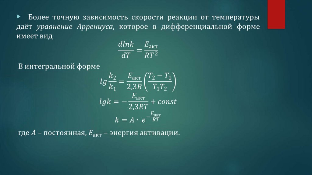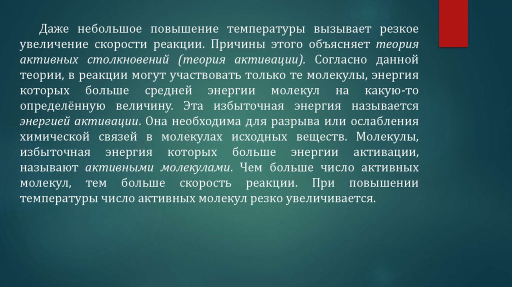 Даже небольшое повышение температуры вызывает резкоеувеличение скорости реакции. Причины этого объясняет теория