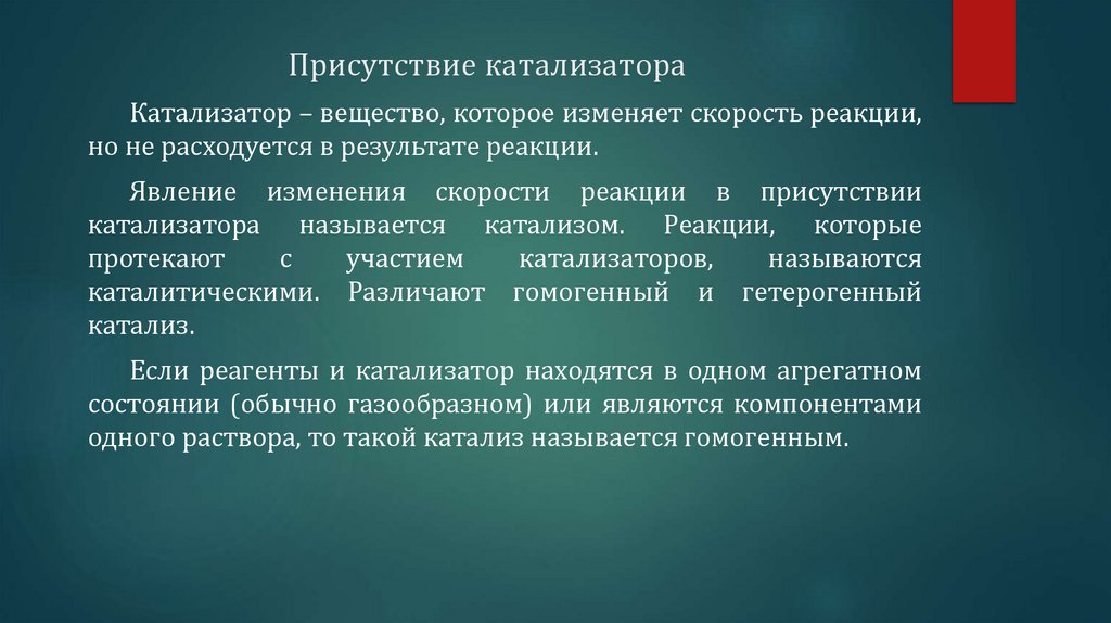 Катализатор – вещество, которое изменяет скорость реакции,но не расходуется в результате реакции.