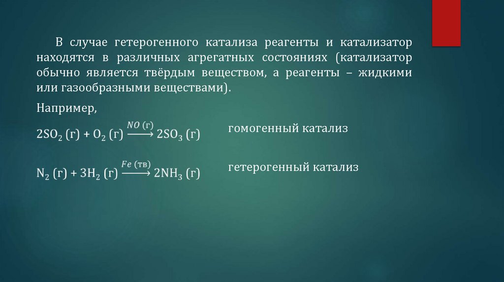 В случае гетерогенного катализа реагенты и катализаторнаходятся в различных агрегатных состояниях (катализатор