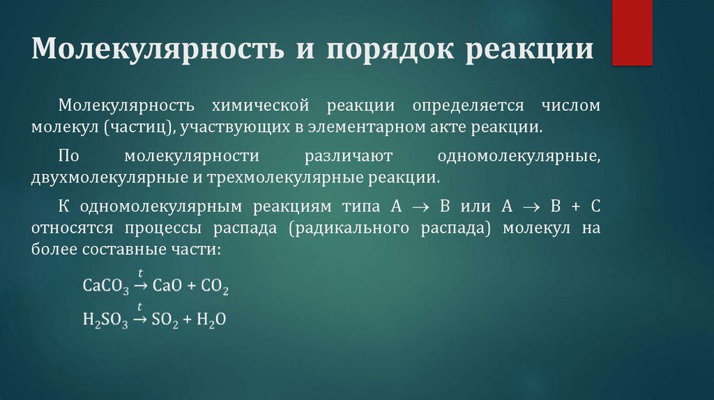Молекулярность химической реакции определяется числоммолекул (частиц), участвующих в элементарном акте реакции.