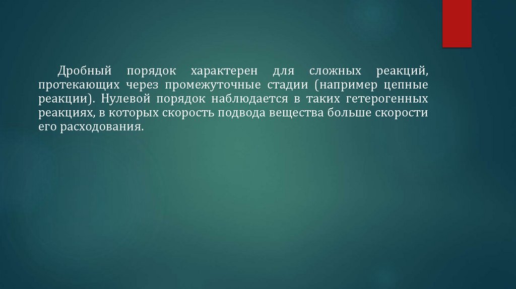 Дробный порядок характерен для сложных реакций,протекающих через промежуточные стадии (например цепные