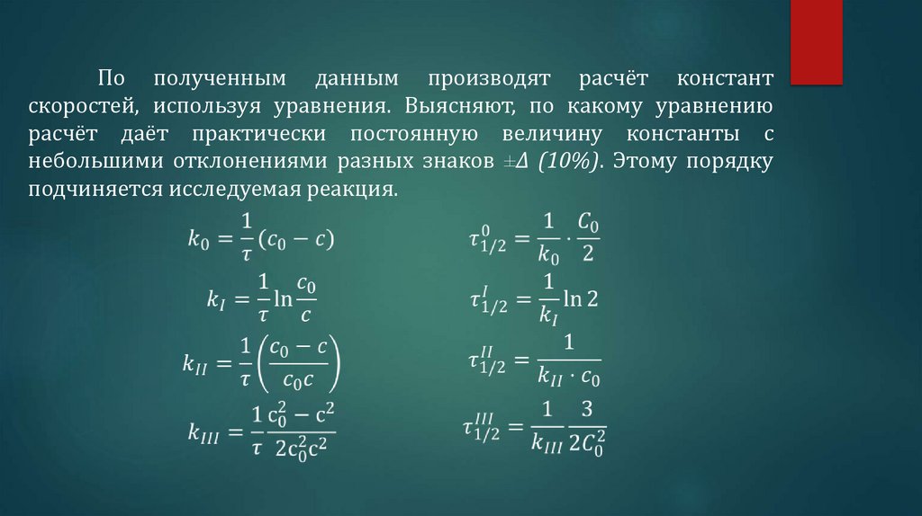 По полученным данным производят расчёт константскоростей, используя уравнения. Выясняют, по какому уравнению