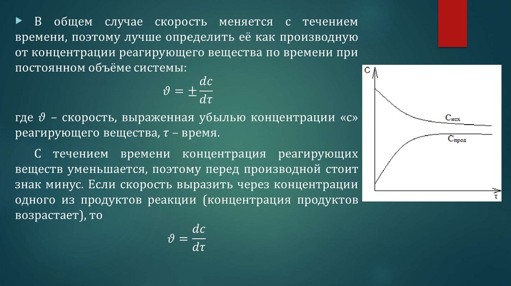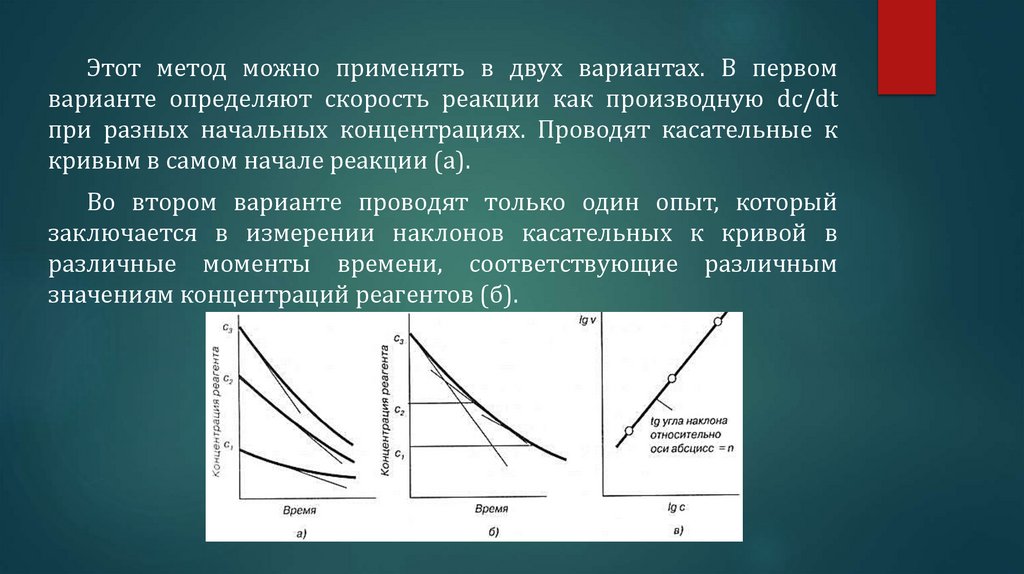 Этот метод можно применять в двух вариантах. В первомварианте определяют скорость реакции как производную dc/dt