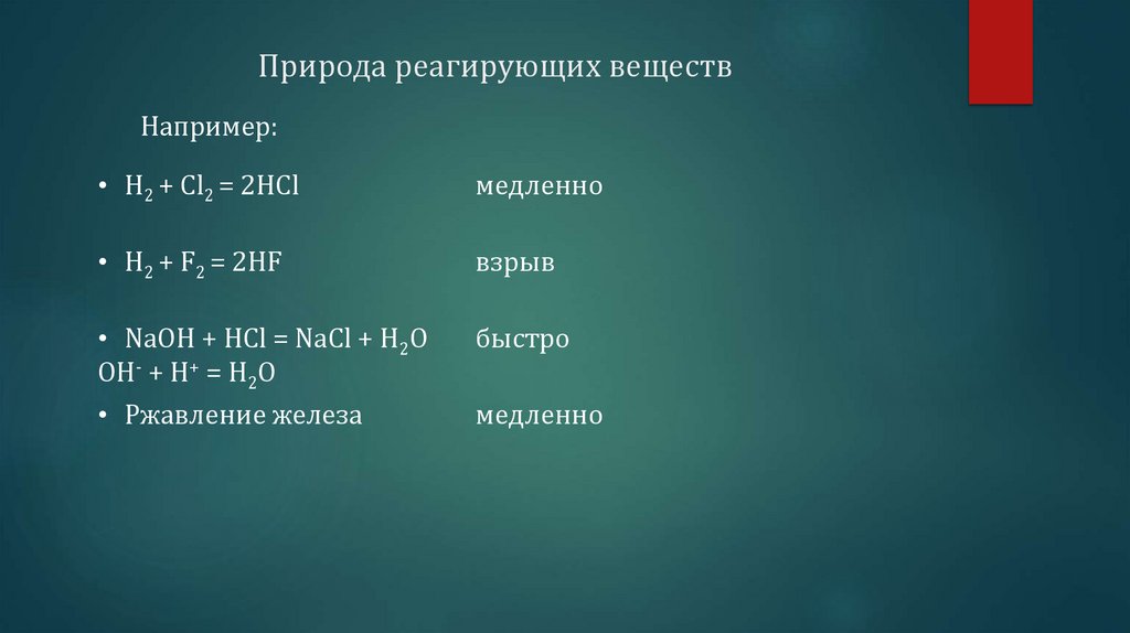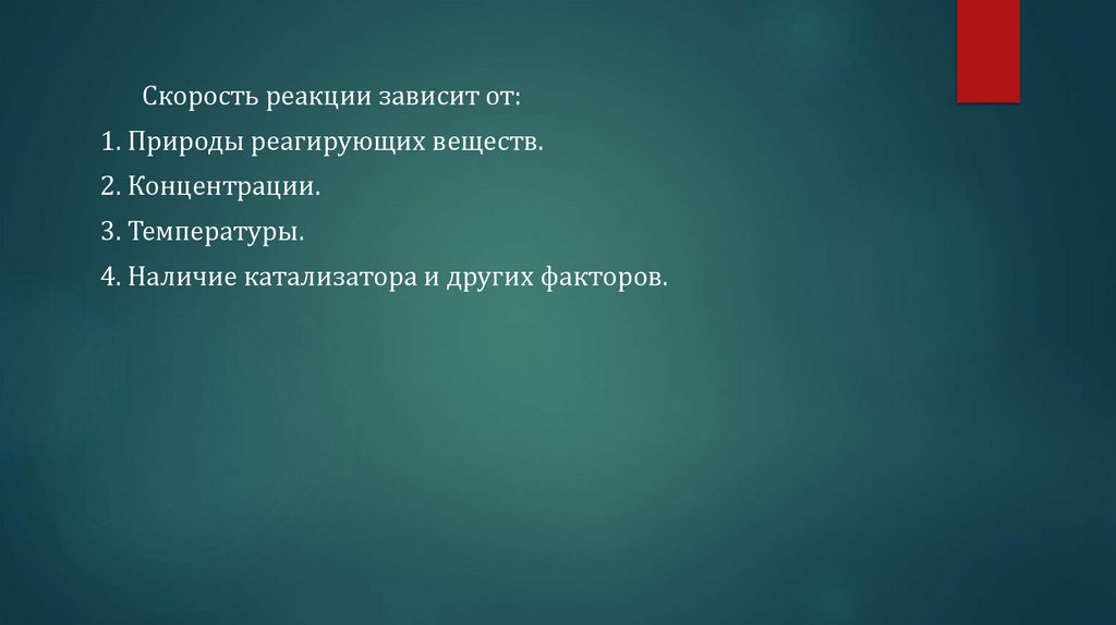 Скорость реакции зависит от:1. Природы реагирующих веществ.