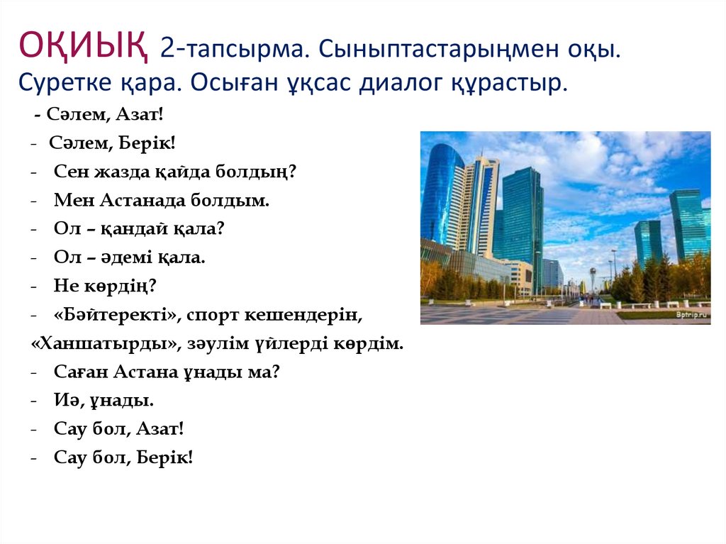 5. ОҚИЫҚ 2-тапсырма. Сыныптастарыңмен оқы. Суретке қара. Осыған ұқсас диалог құрастыр.