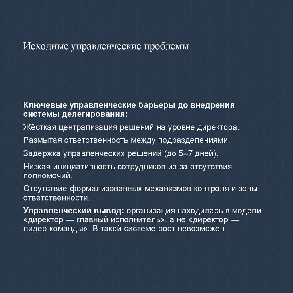 Исходные управленческие проблемыКлючевые управленческие барьеры до внедрения