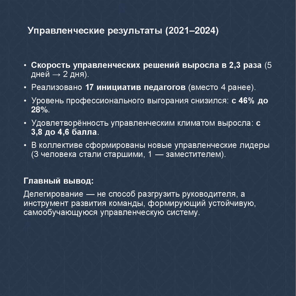 Управленческие результаты (2021–2024)• Скорость управленческих решений выросла в 2,3 раза (5