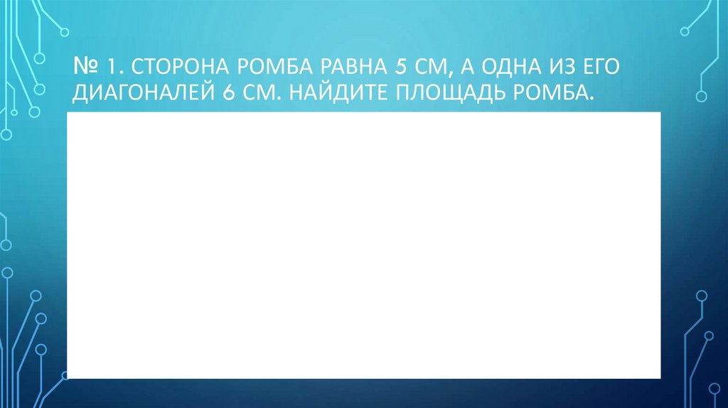 № 1. СТОРОНА РОМБА РАВНА 5 СМ, А ОДНА ИЗ ЕГОДИАГОНАЛЕЙ 6 СМ. НАЙДИТЕ ПЛОЩАДЬ РОМБА.